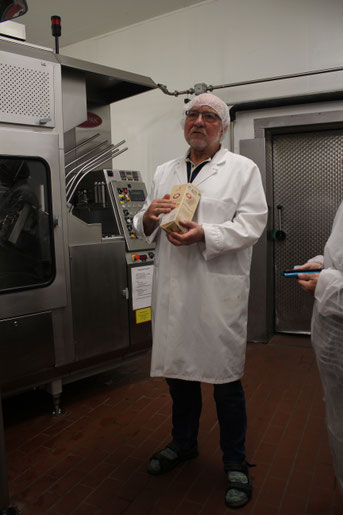 Herr Pinetzki (gelernter Koch, ehrenamtlich im Förderverein tätig) und sein Kollege Kai führten uns durch die Meierei und erklärten uns die Maschinen für die Herstellung bzw. Verarbeitung ihrer Produkte. Es wird traditionelle Frischmilch, Horster Sauerrahm Markenbutter, Kräuterbutter, Meersalzbutter, Buttermilch, Créme Fraîche, Schlagsahne und Schulmilch produziert. Alles hat einen hochwertigen Geschmack.
